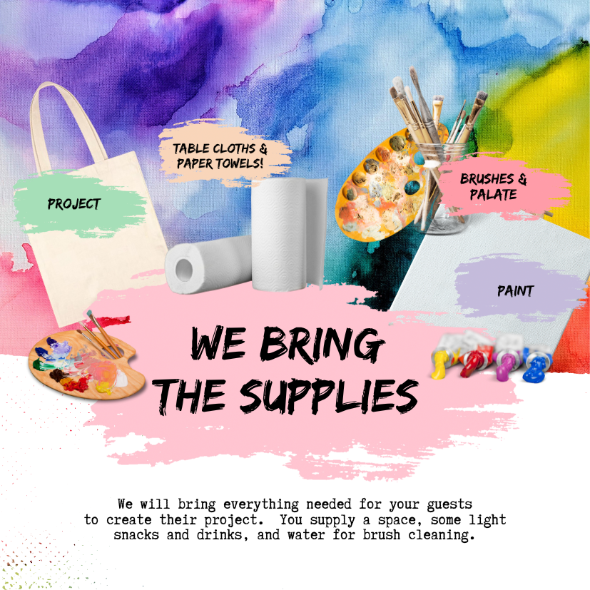 We will bring everything needed for your guests to create their project. You supply a space, some light snacks and drinks, and water for brush cleaning.